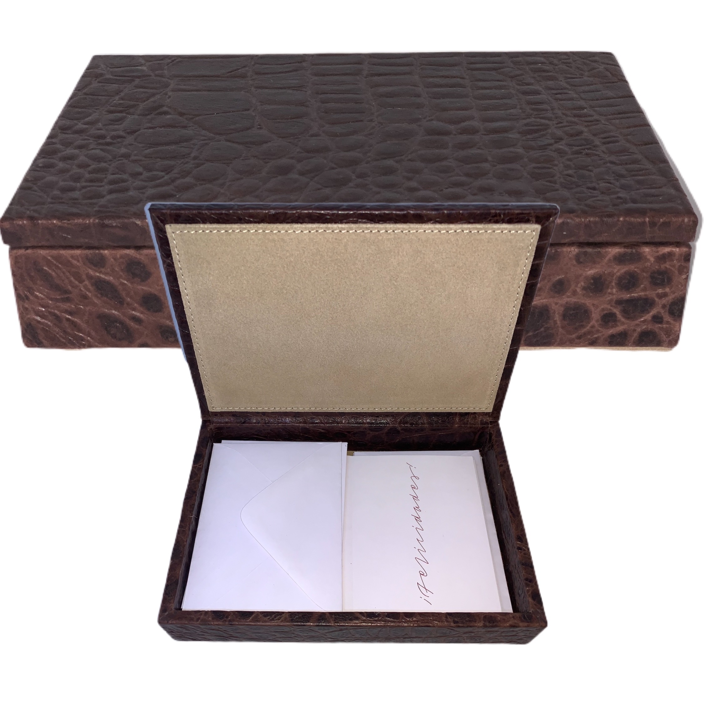 Caja forrada en su exterior en piel y contiene 15 tarjetas de agradeciemientos genericos con sus sobres.