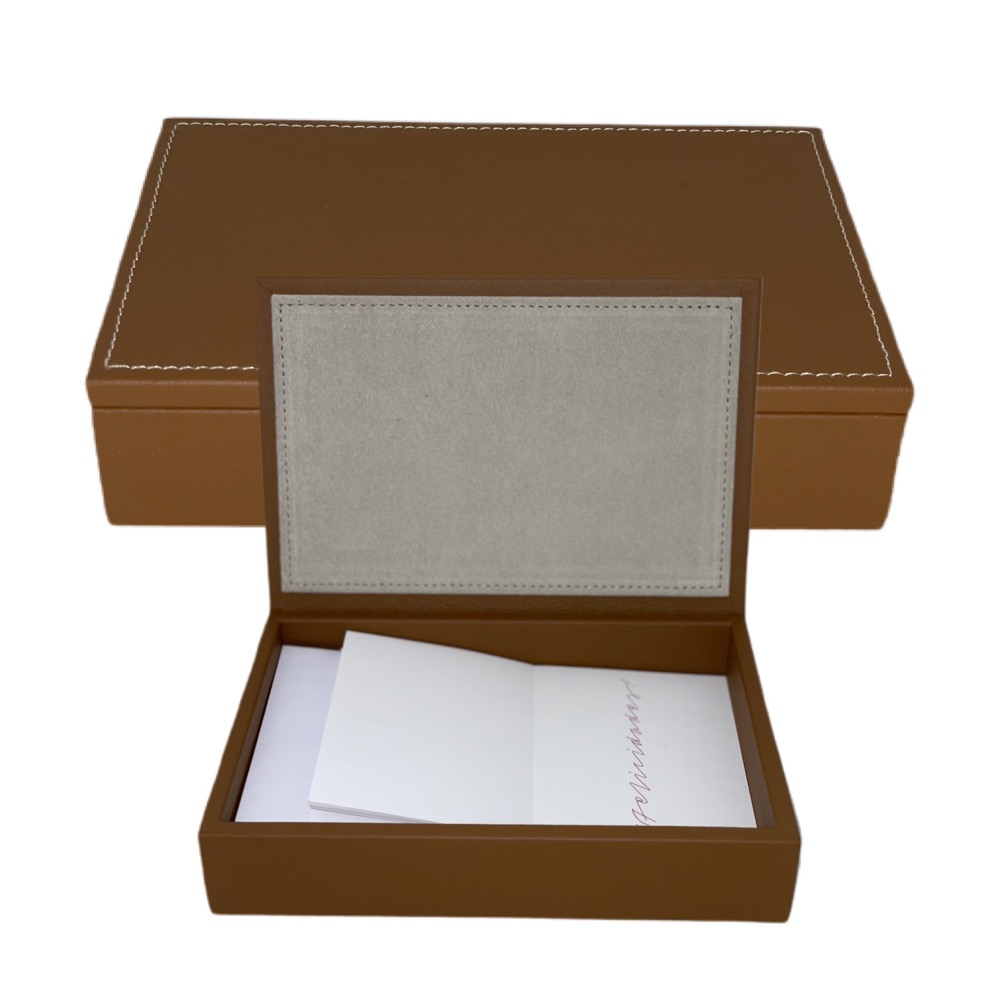 Caja forrada en su exterior en piel y contiene 15 tarjetas de agradeciemientos genericos con sus sobres.