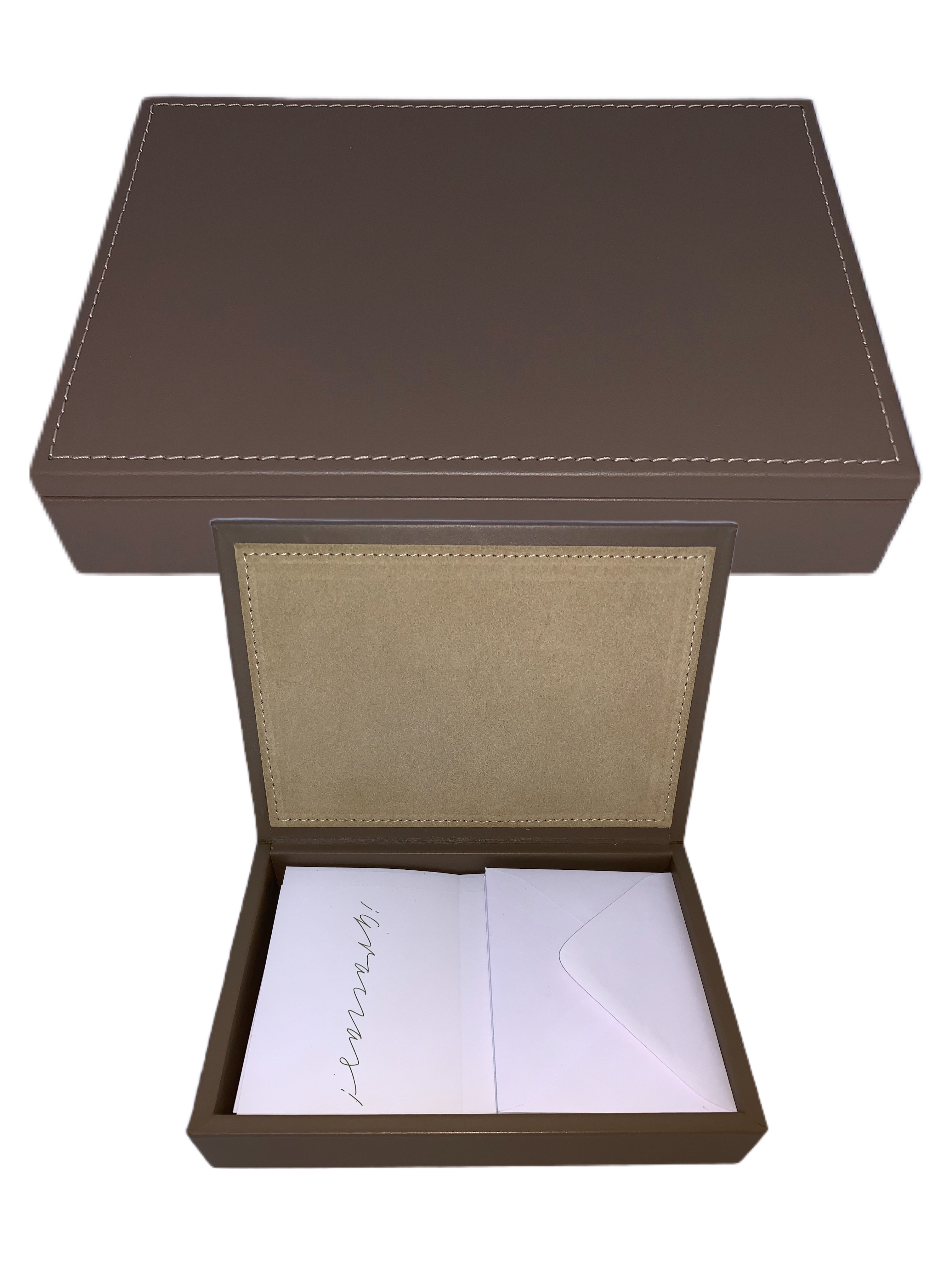 Caja forrada en su exterior en piel y contiene 15 tarjetas de agradeciemientos genericos con sus sobres.