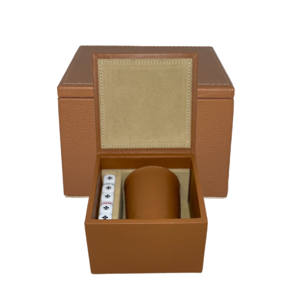 Caja con un cubilete fabricado en piel y 5 dados poker.