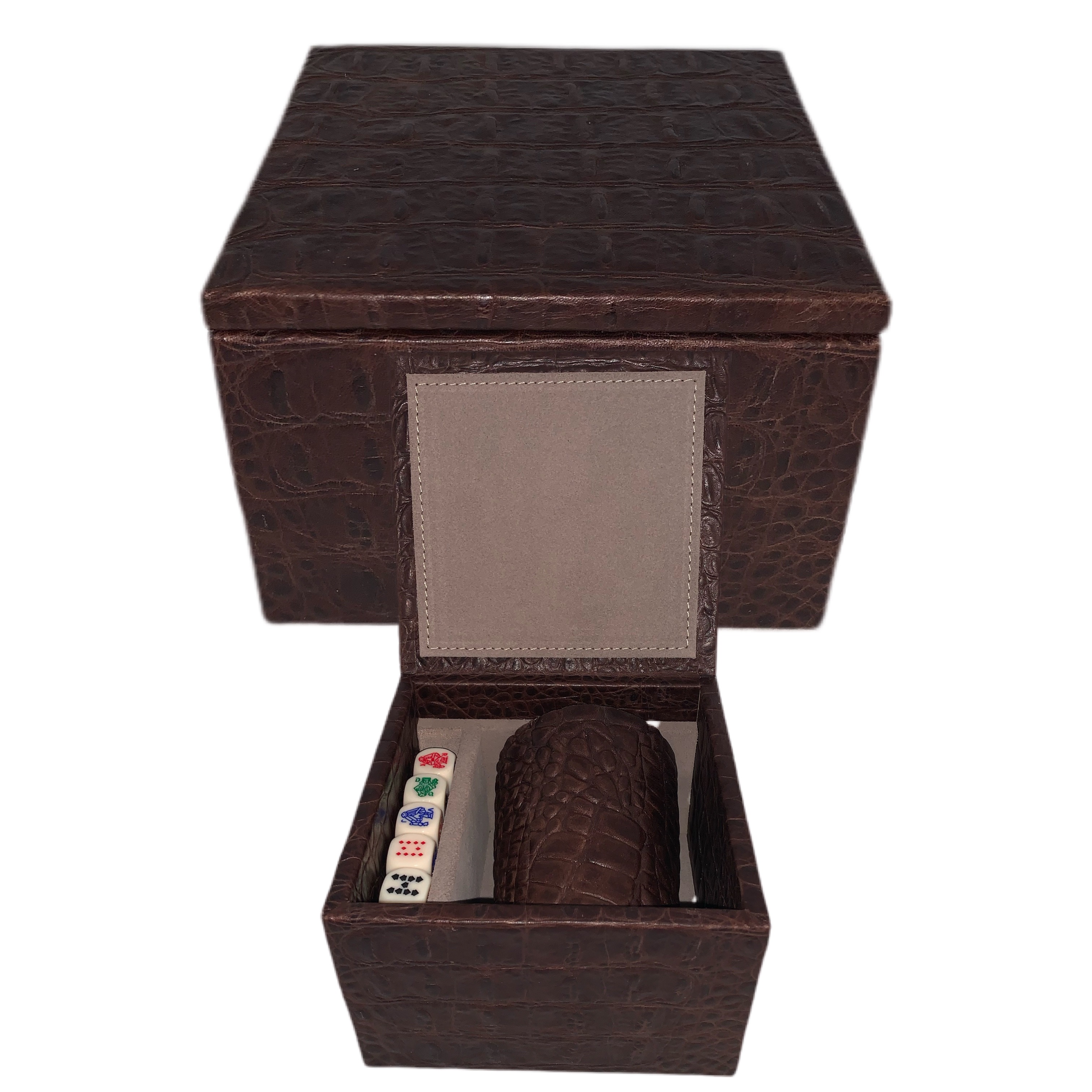 Caja con un cubilete fabricado en piel y 5 dados poker.