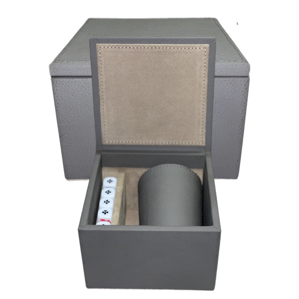 Caja con un cubilete fabricado en piel y 5 dados poker.