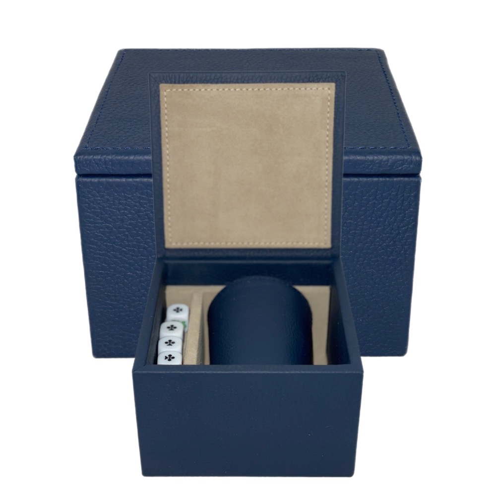 Caja con un cubilete fabricado en piel y 5 dados poker.