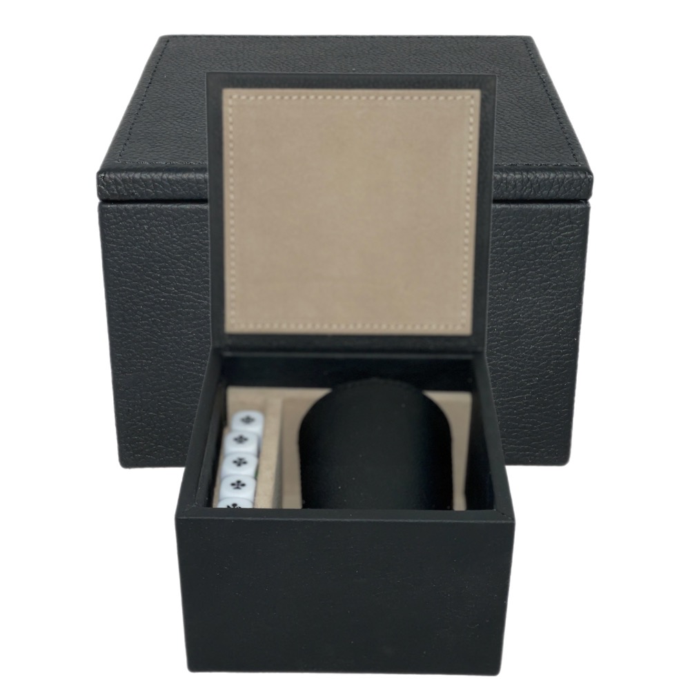 Caja con un cubilete fabricado en piel y 5 dados poker.