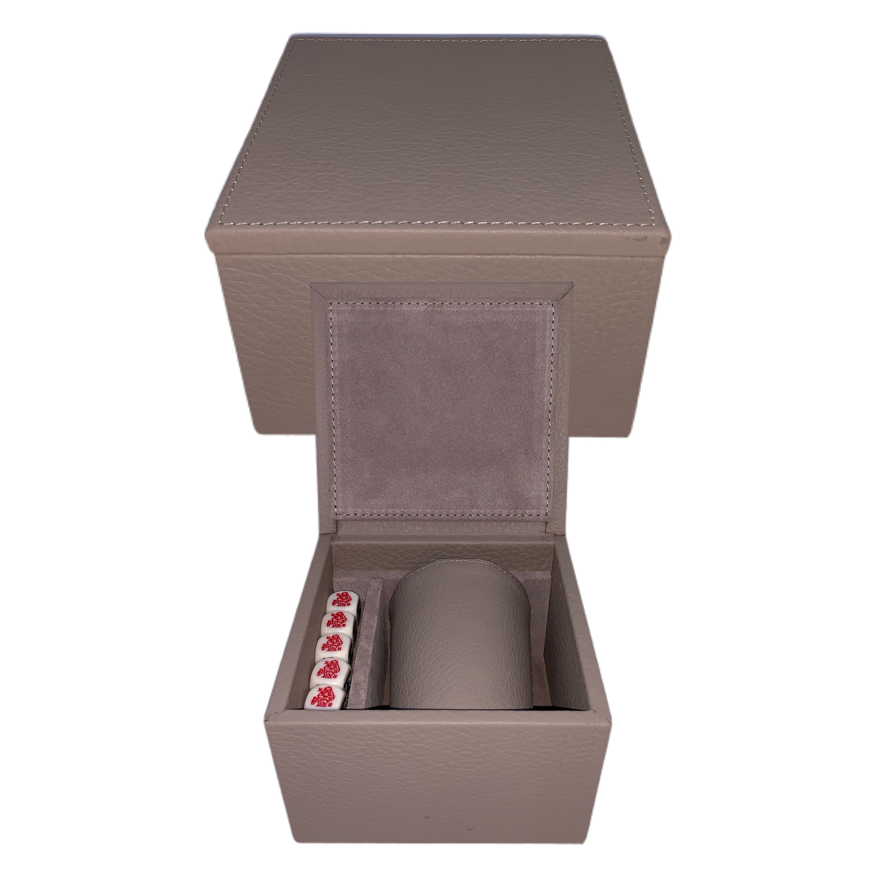 Caja con un cubilete fabricado en piel y 5 dados poker.