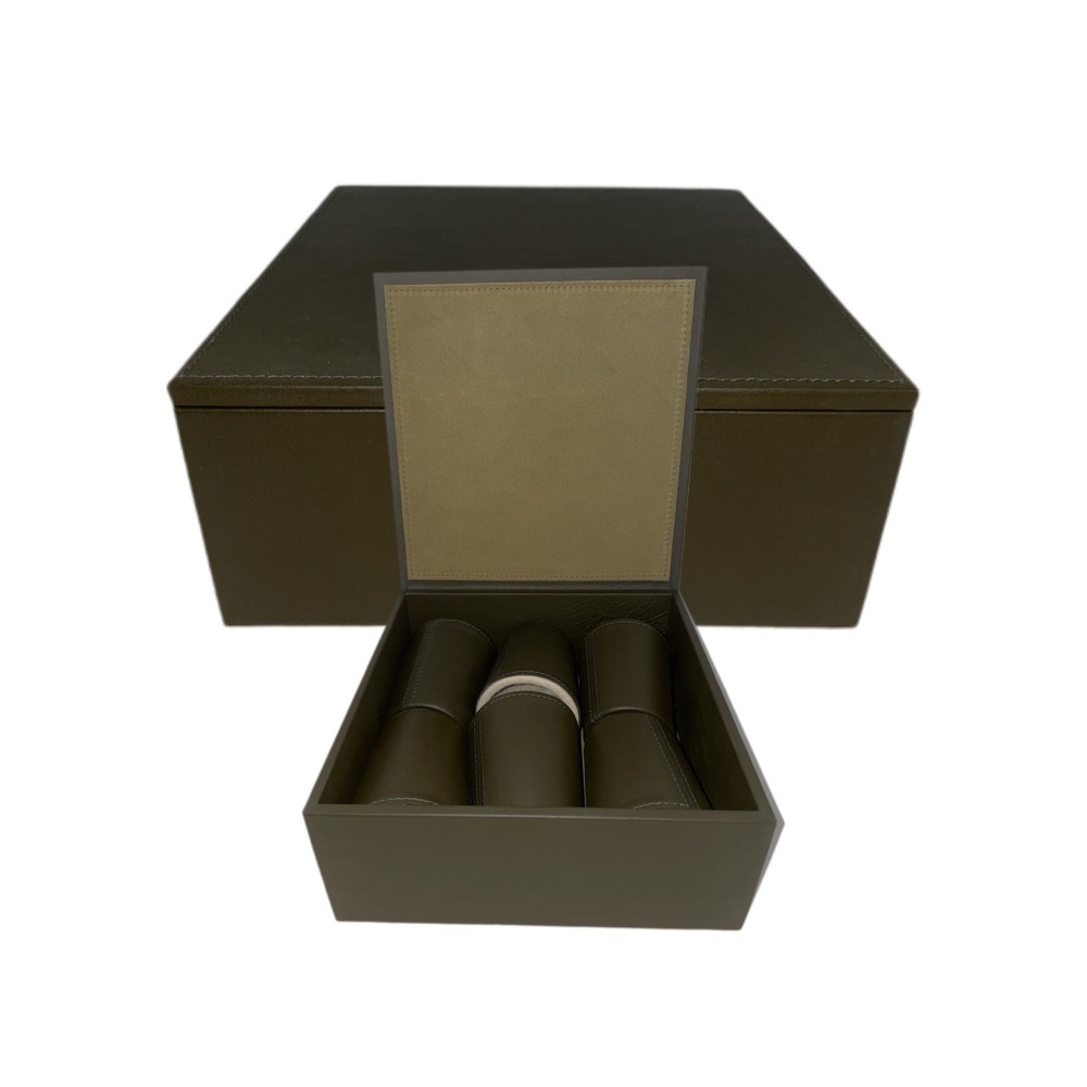 La caja contiene 6 vasos forrados de piel con interior de paño cada uno con 5 dados poker.