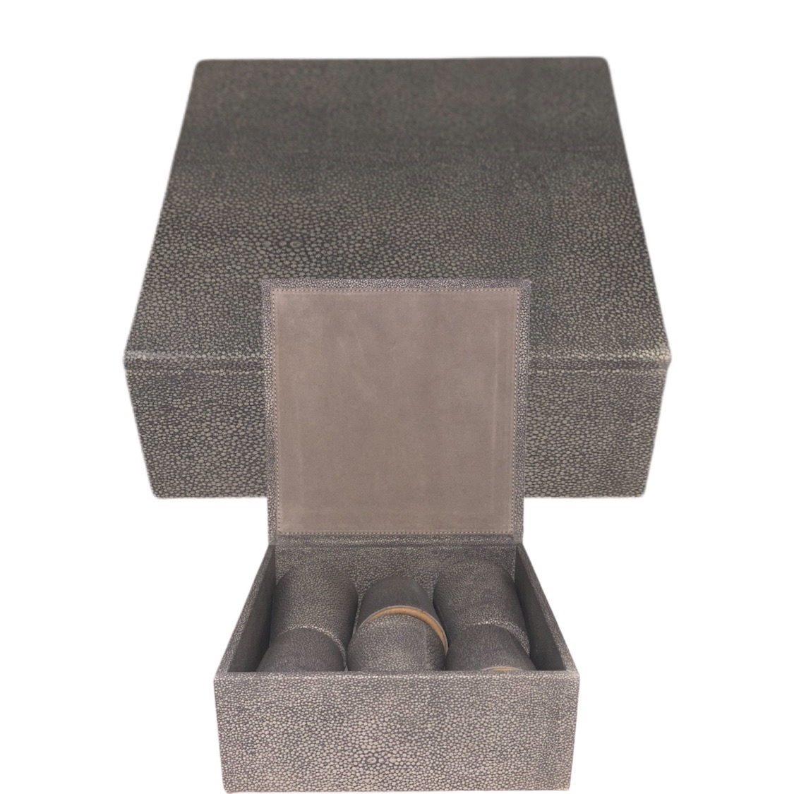 La caja contiene 6 vasos cada uno con 5 dados poker. La piel es origen vacuno imitación mantarraya.