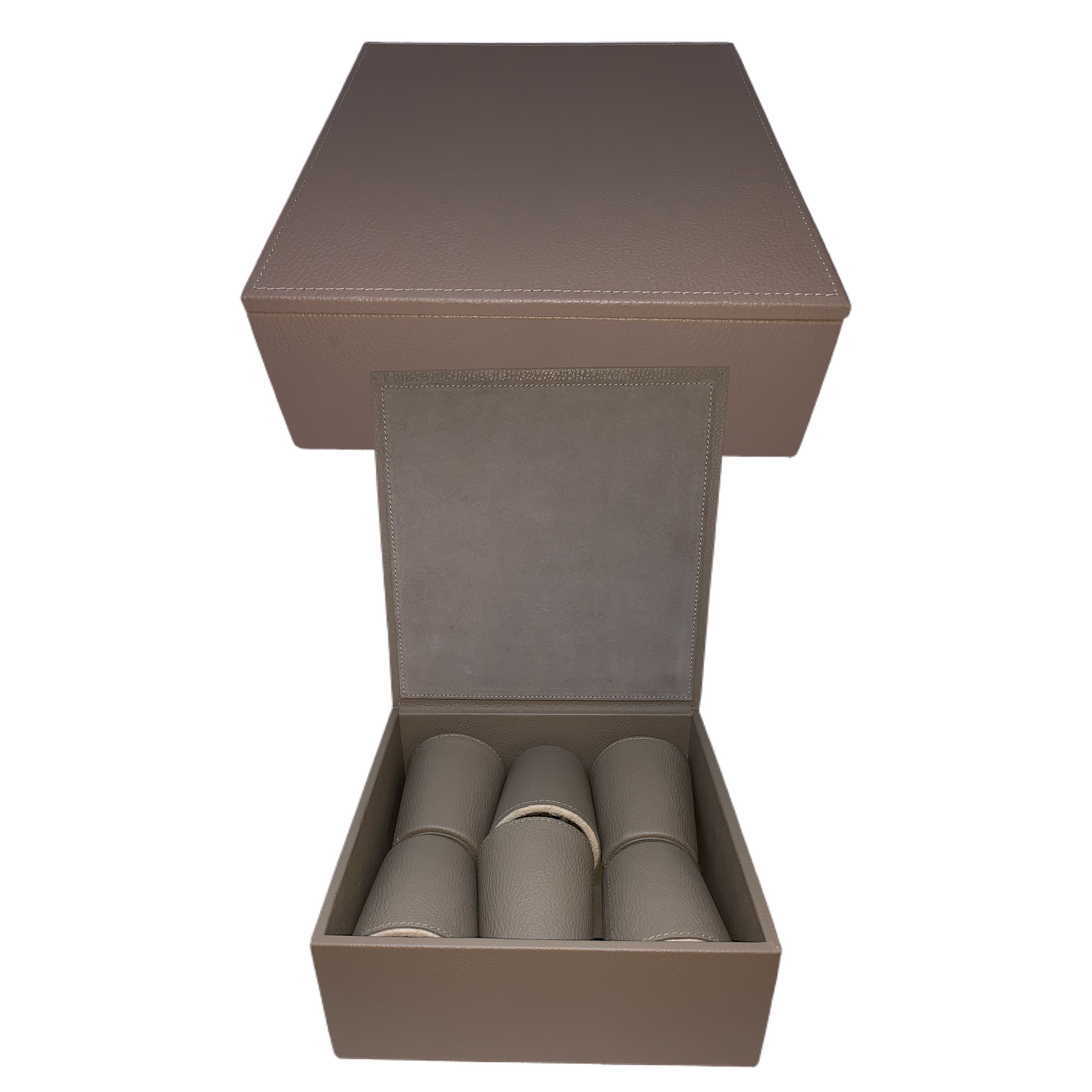 La caja contiene 6 vasos cada uno con 5 dados poker.
