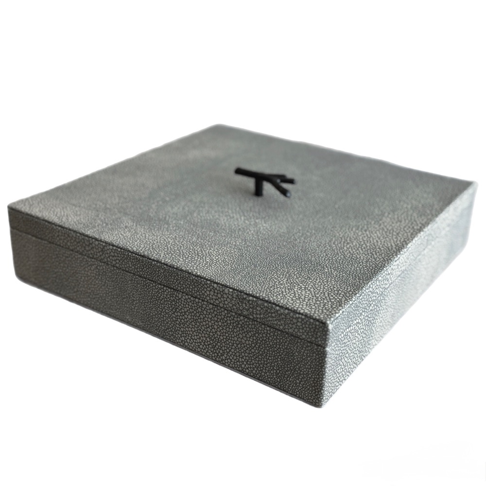 Caja elaborada en piel de mantarrya con diseño cuadrado.