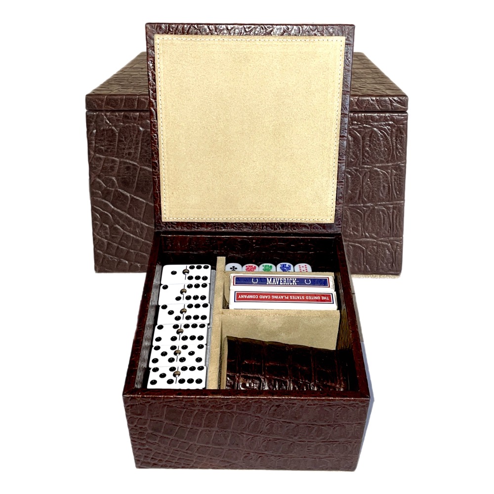 Caja de piel, en su interior contiene: un juego de cubilete (vaso con 5 dados poker), 2 juegos de barajas y un domino. Piel con grabado de mantarraya.