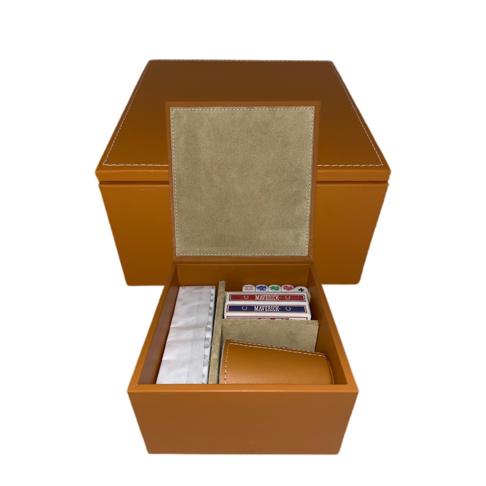 Caja de piel, en su interior contiene: un juego de cubilete (vaso con 5 dados poker), 2 juegos de barajas y un domino.