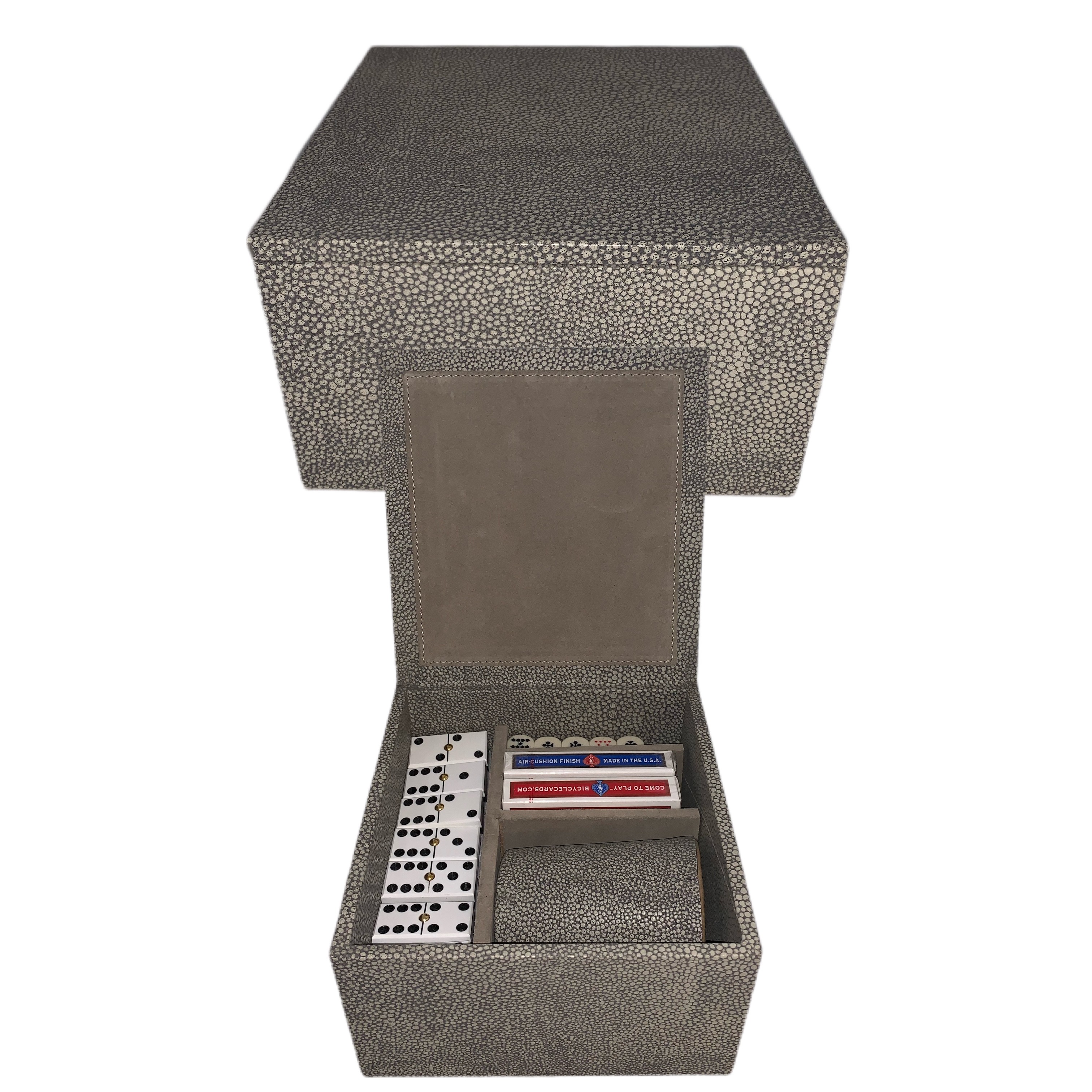 Caja de piel, en su interior contiene: un juego de cubilete (vaso con 5 dados poker), 2 juegos de barajas y un domino. Piel con grabado de mantarraya.