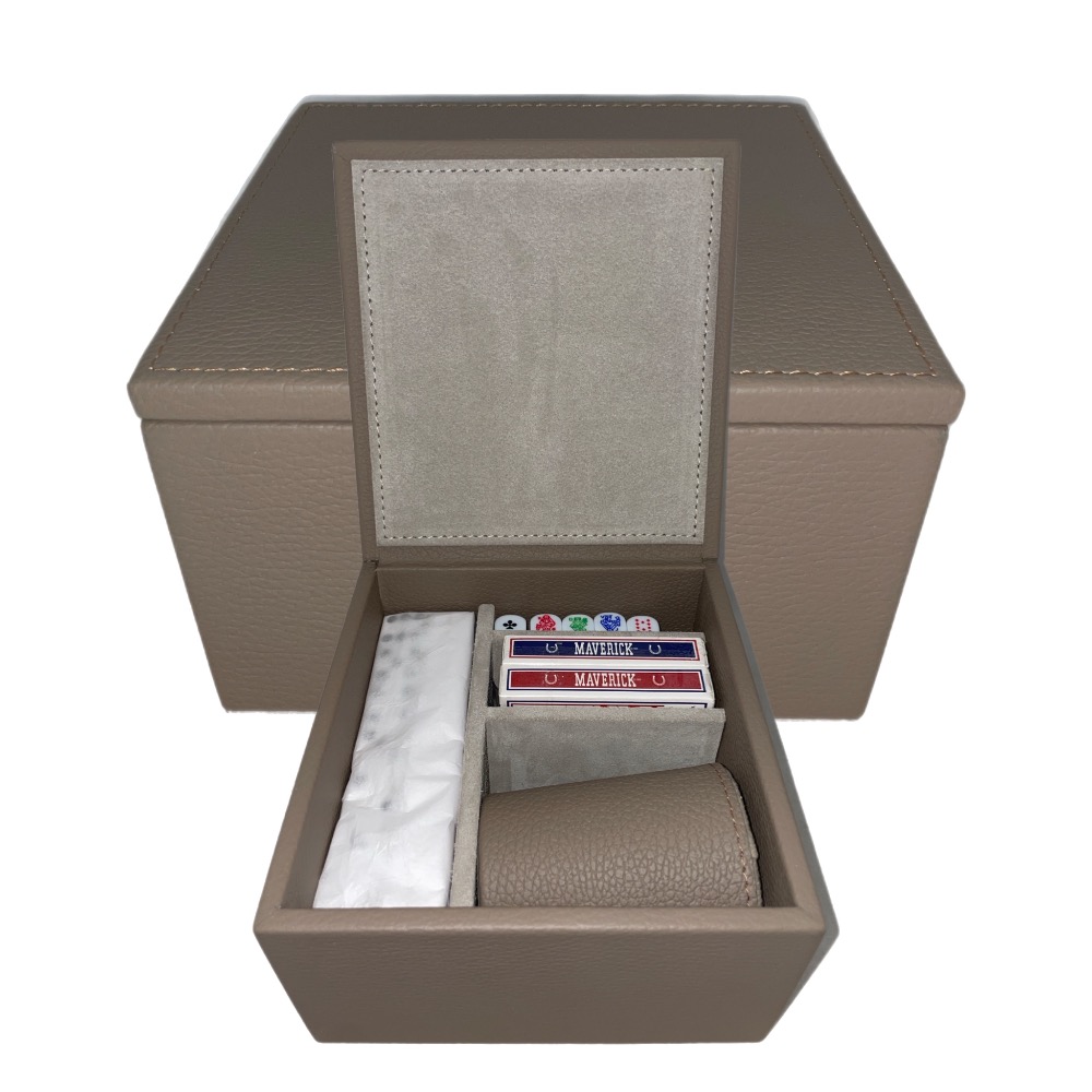 Caja de piel, en su interior contiene: 1 Juego de cubilete (vaso con 5 dados poker) 2 Juegos de barajas 1 Dominó