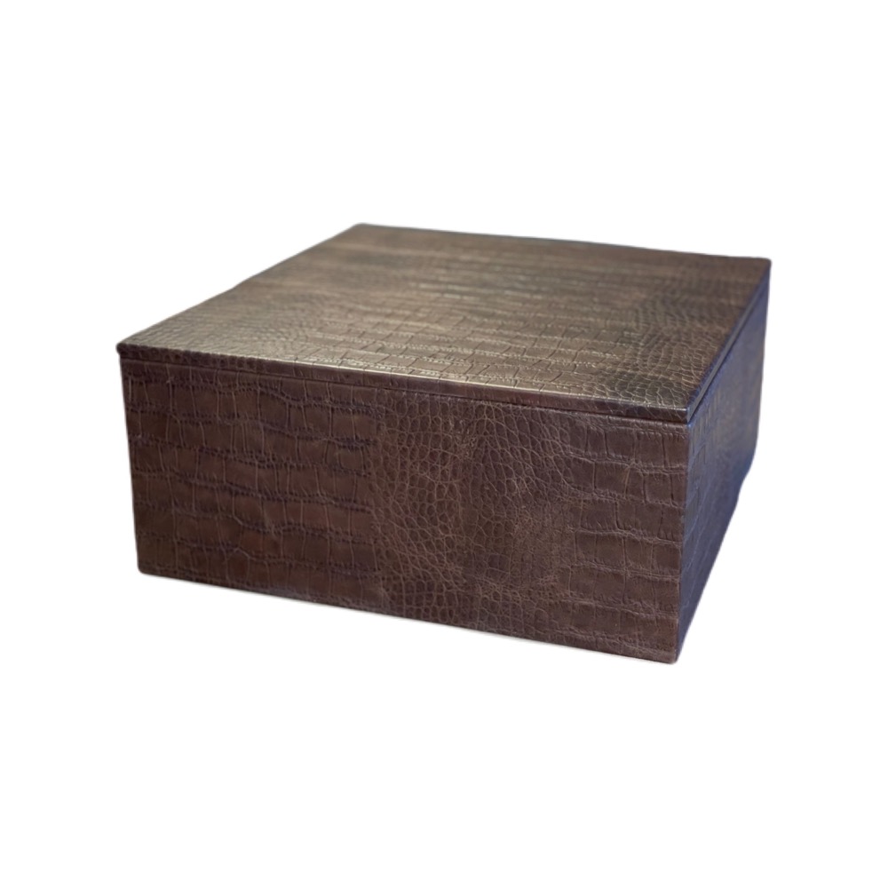 Caja forrada en piel que brinda un toque decorativo y elegante a cualquier espacio.