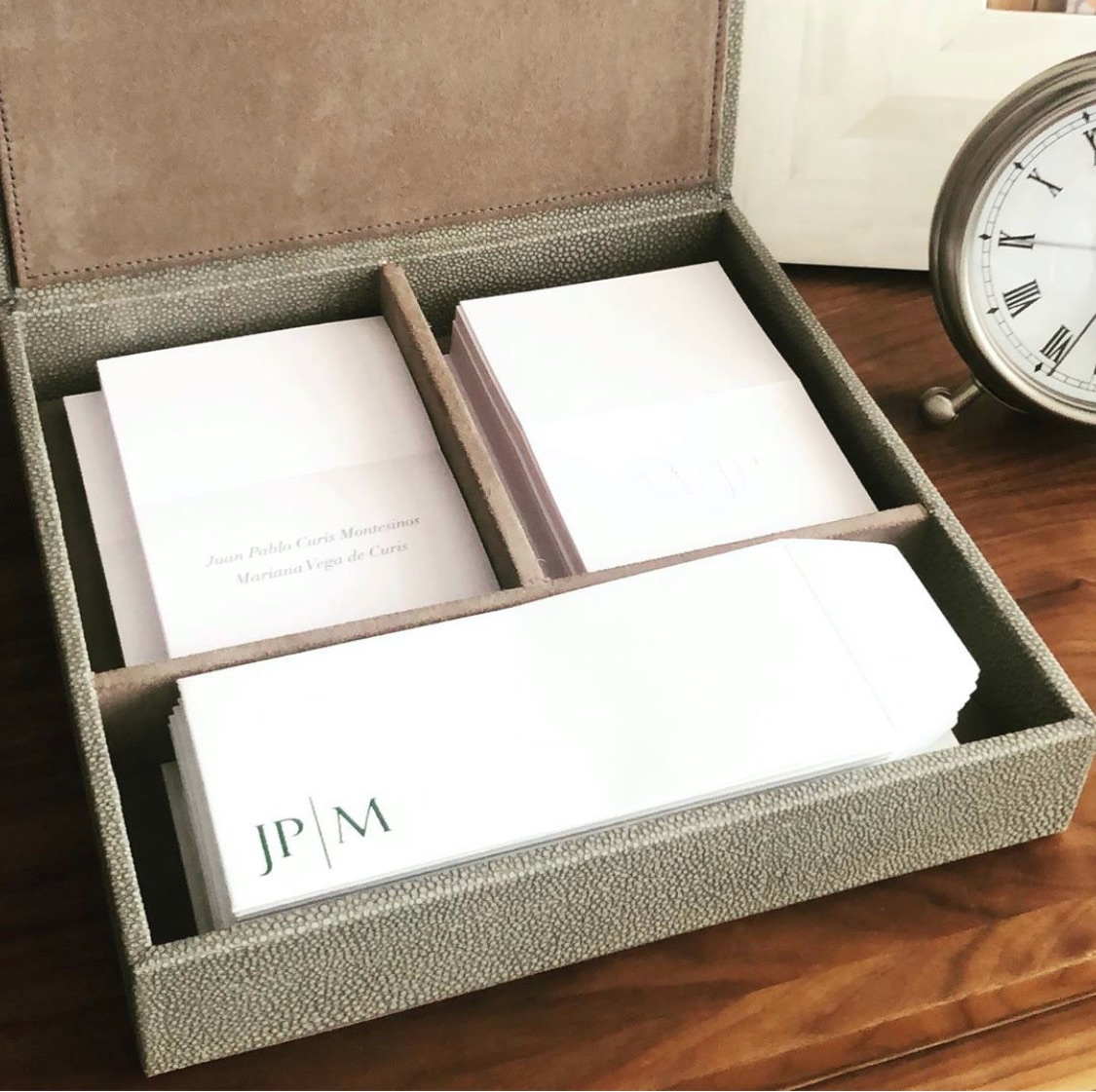 Caja forrada de piel y papeleria personalizada. Incluye: 100 tarjetas sencillas 100 tarjetas dobles 100 sobres para tarjetas 30 sobres de dinero . Este producto se entrega de 2 - 3 Semanas desués de la compra. En COLABORACIONES no hay cambios ni devoluciones.