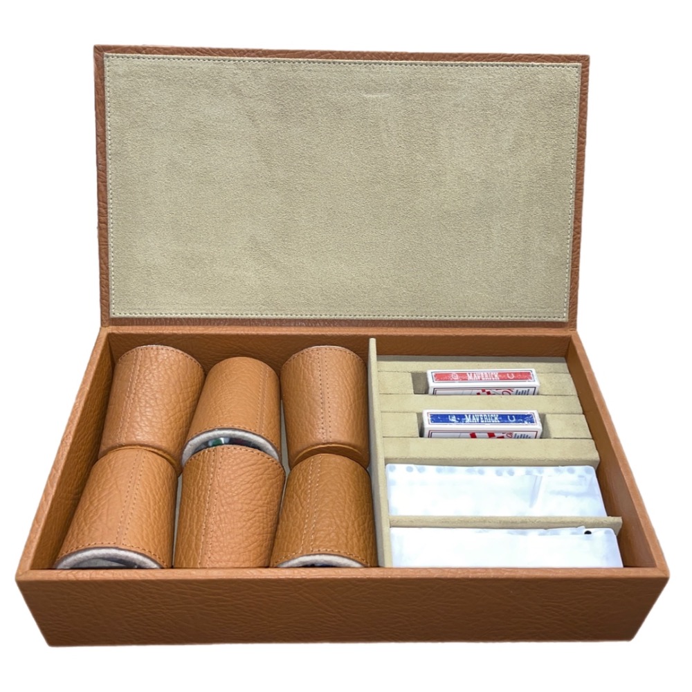 Caja forrada de piel, en su interior contiene: 1 Juego de Domino 2 Juego de Barajas 6 Cubiletes con dados poker