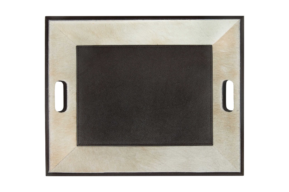 Cubierta en piel café y en su interior pelo de vaca de color blanco. Debido a que la piel de pelo es natural puede tener pequenas variaciones en el tono del color cada pieza.