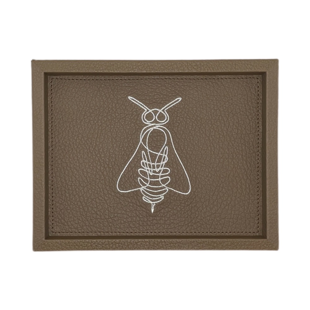 Charola rectangular mini fabricada en piel, con una abeja bordada.