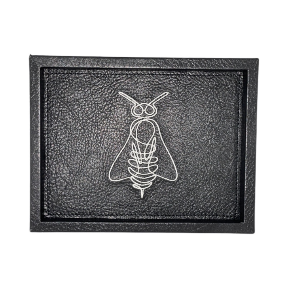 Charola rectangular mini fabricada en piel, con una abeja bordada.