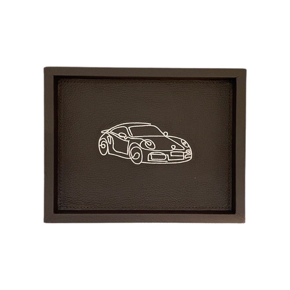 Charola rectangular mini fabricada en piel, con un coche deportivo bordado.