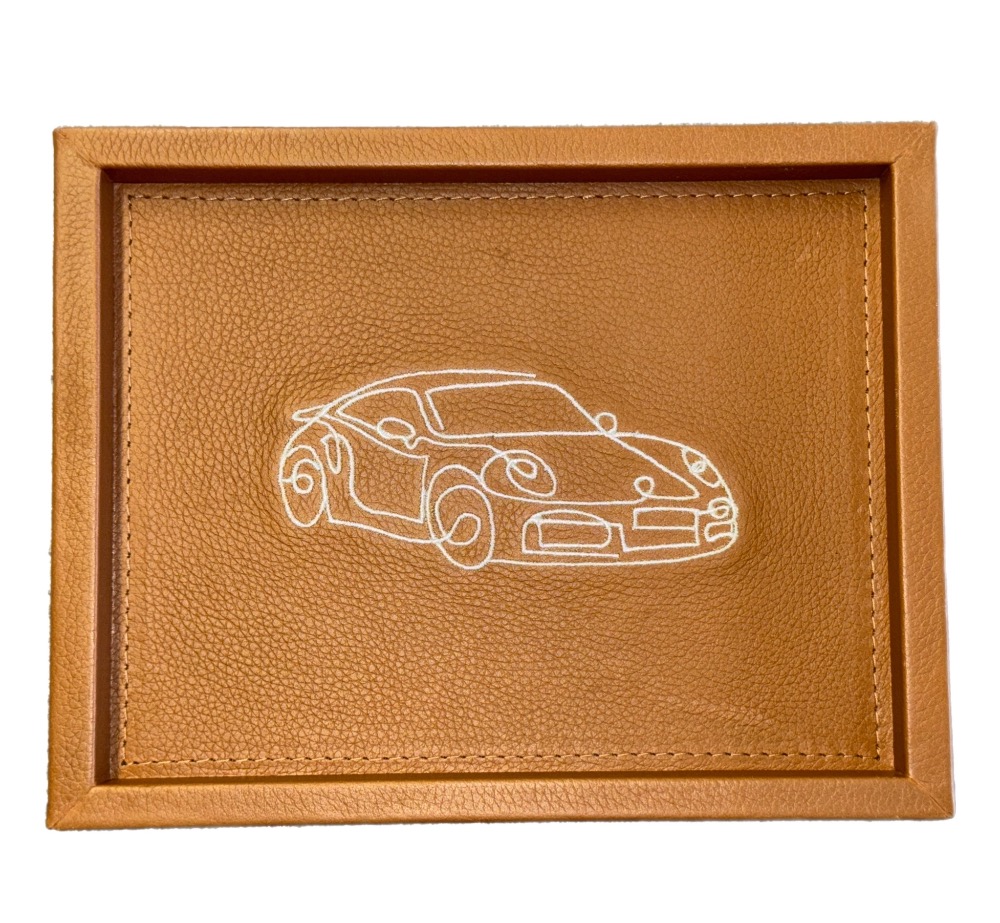 Charola rectangular mini fabricada en piel, con un coche deportivo bordado.