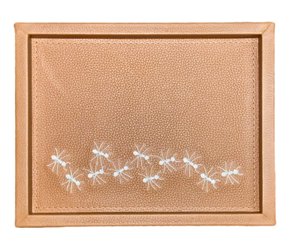 Charola rectangular mini fabricada en piel, con hormigas bordadas.