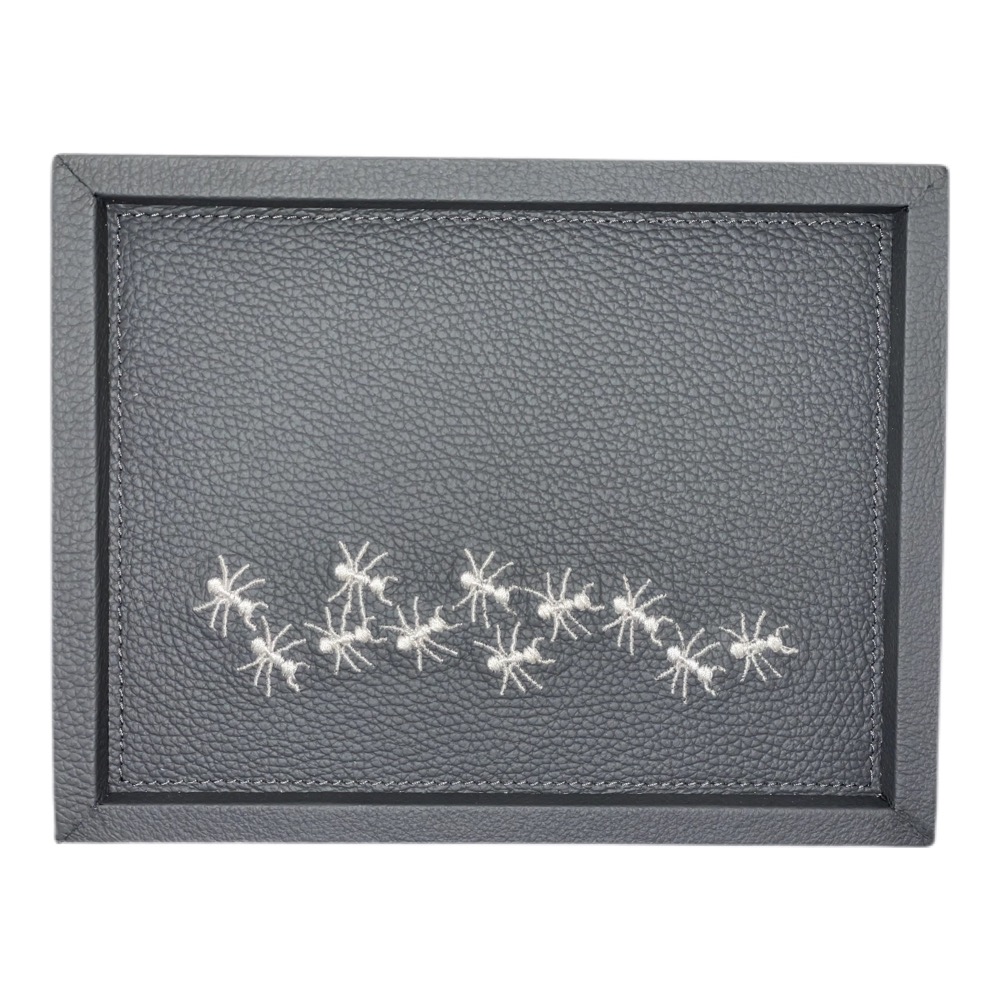 Charola rectangular mini fabricada en piel, con hormigas bordadas.
