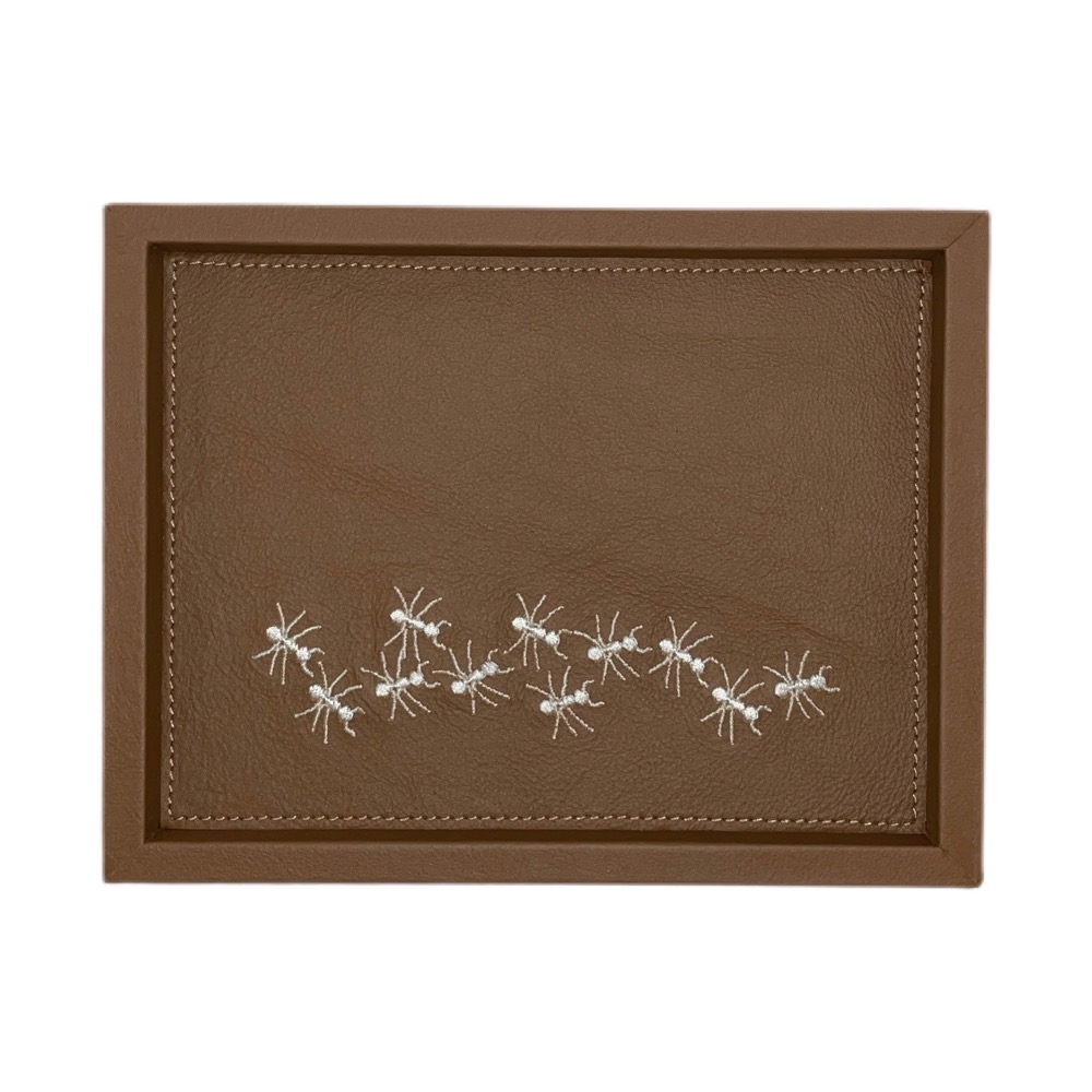 Charola rectangular mini fabricada en piel, con hormigas bordadas.