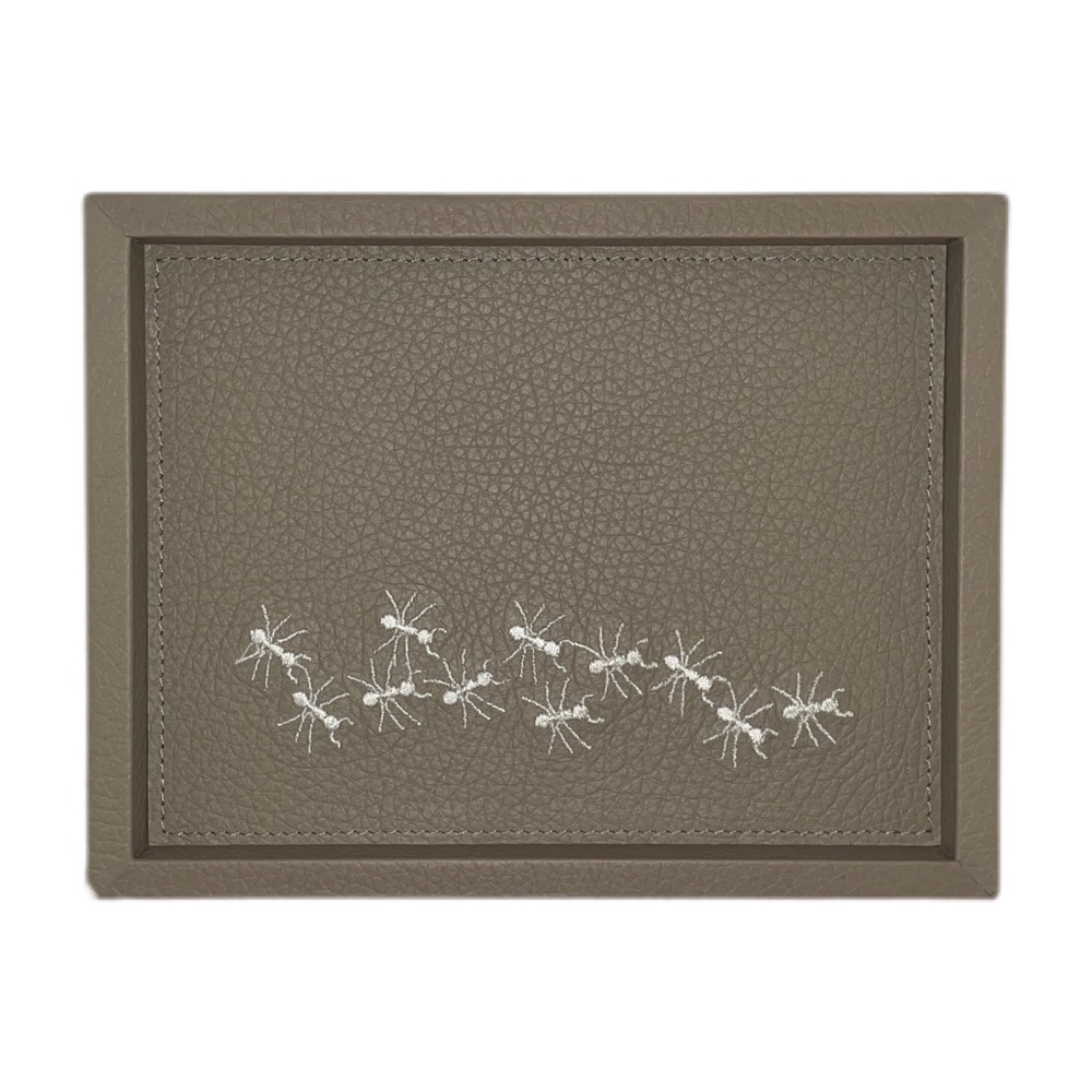 Charola rectangular mini fabricada en piel, con hormigas bordadas.