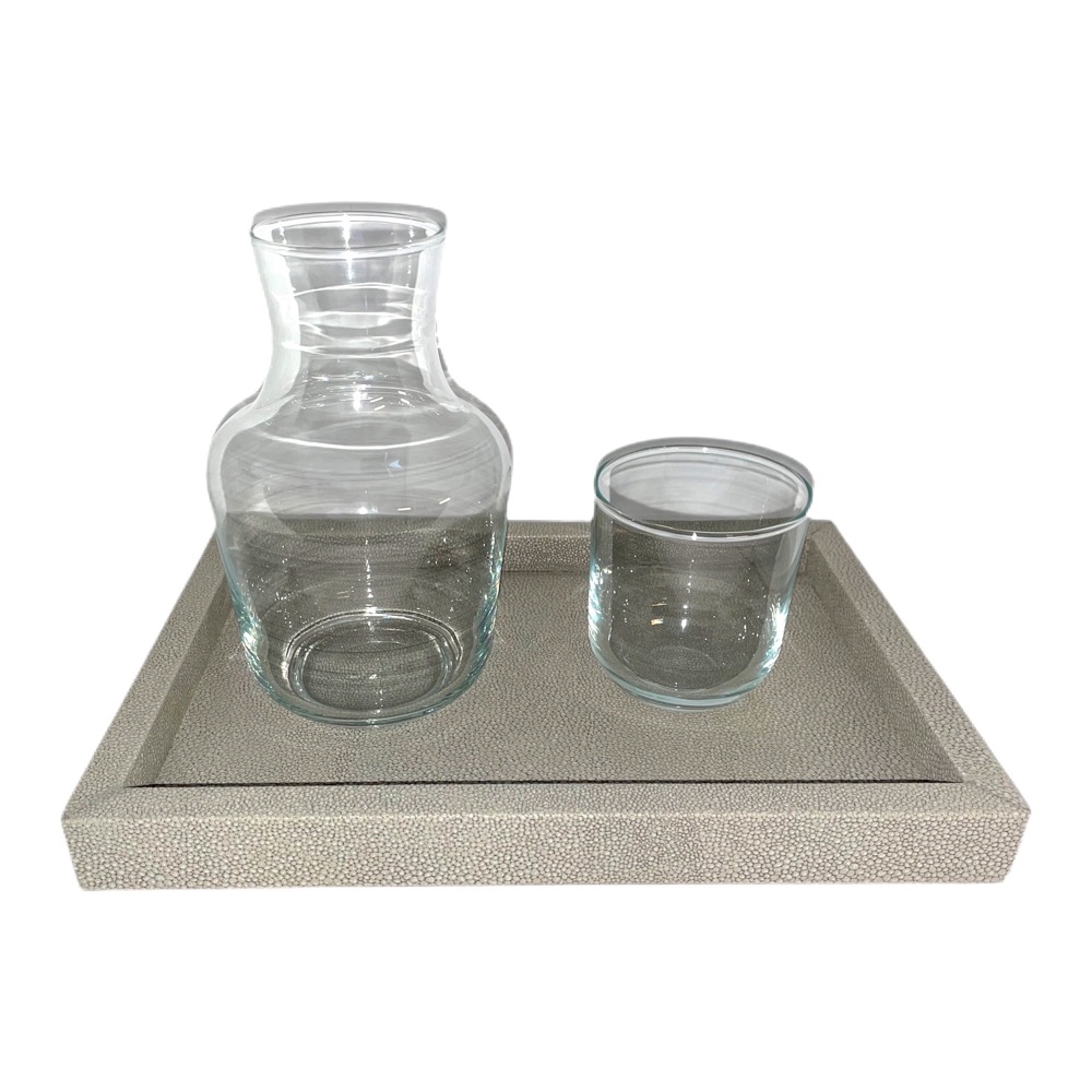Charola rectangular de piel, con jarra de vidrio ideal para poner en tu buro.