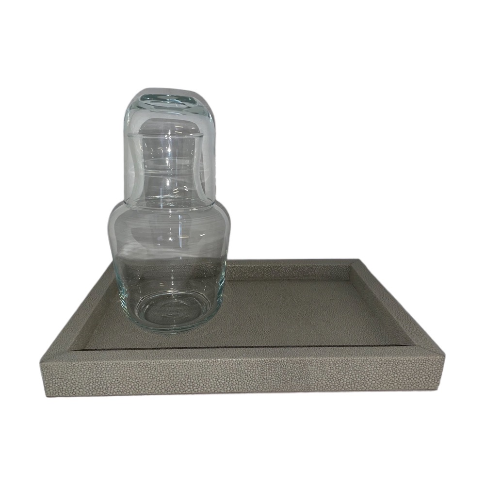 Charola rectangular de piel, con jarra de vidrio ideal para poner en tu buro.