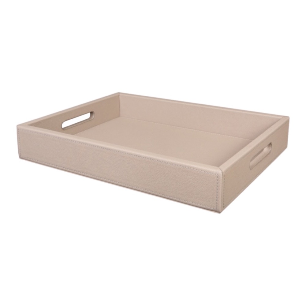 Charola rectangular fabricada en piel reciclada con agarradera.