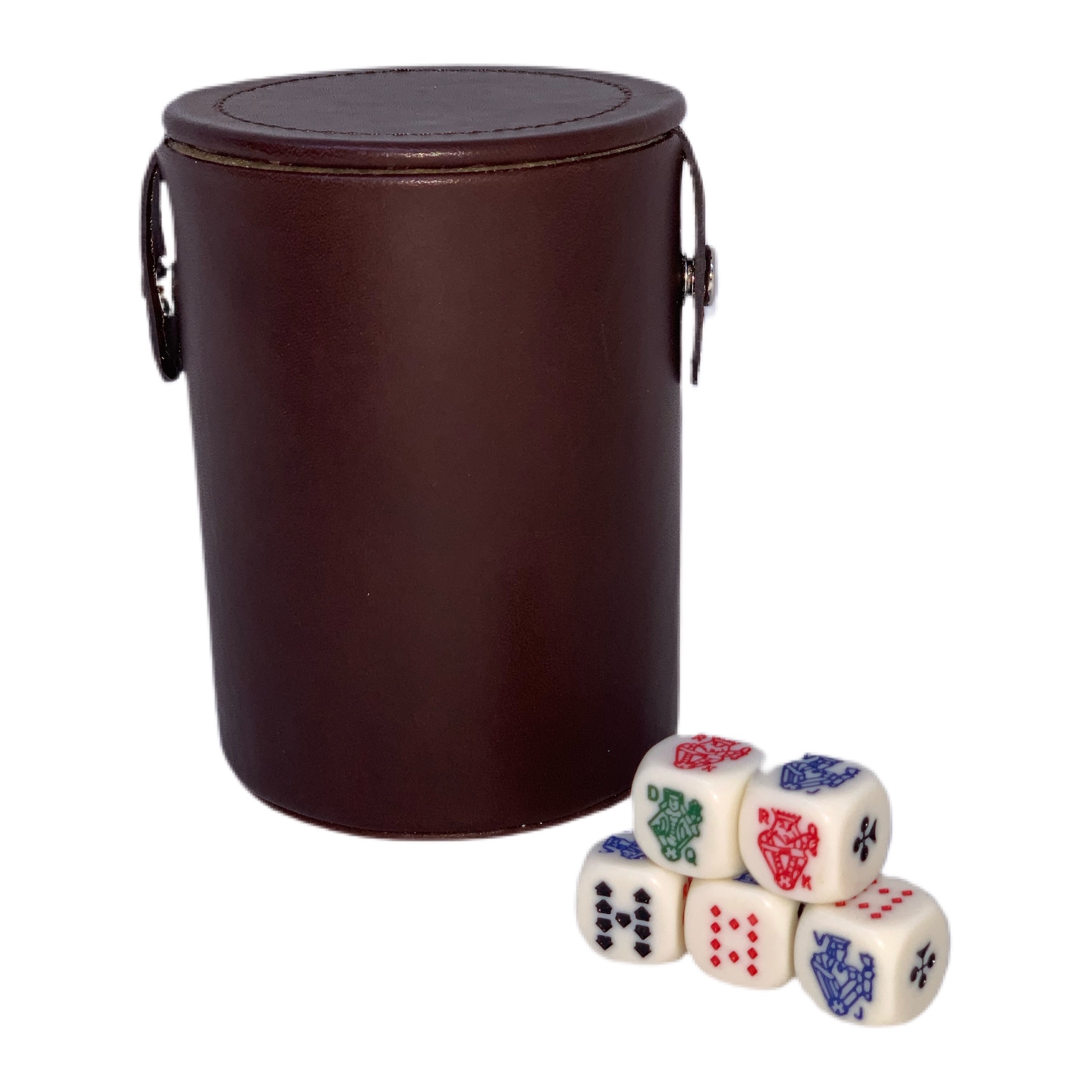 Vaso cibilete con tapa, en el interior 5 dados poker. Este producto al ser OUTLET no tiene cambios ni devoluciones.