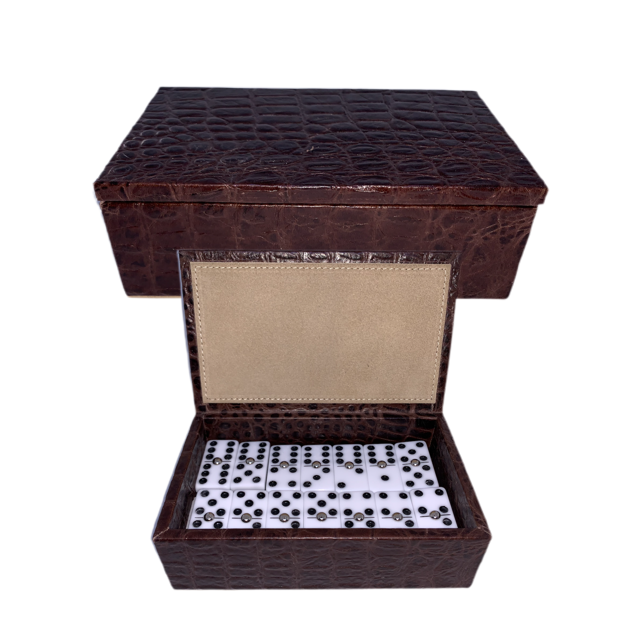 Juego de mesa que se compone de 28 fichas rectangulares. En este juego pueden participar dos, tres o cuatro personas. Caja elaborada en piel,