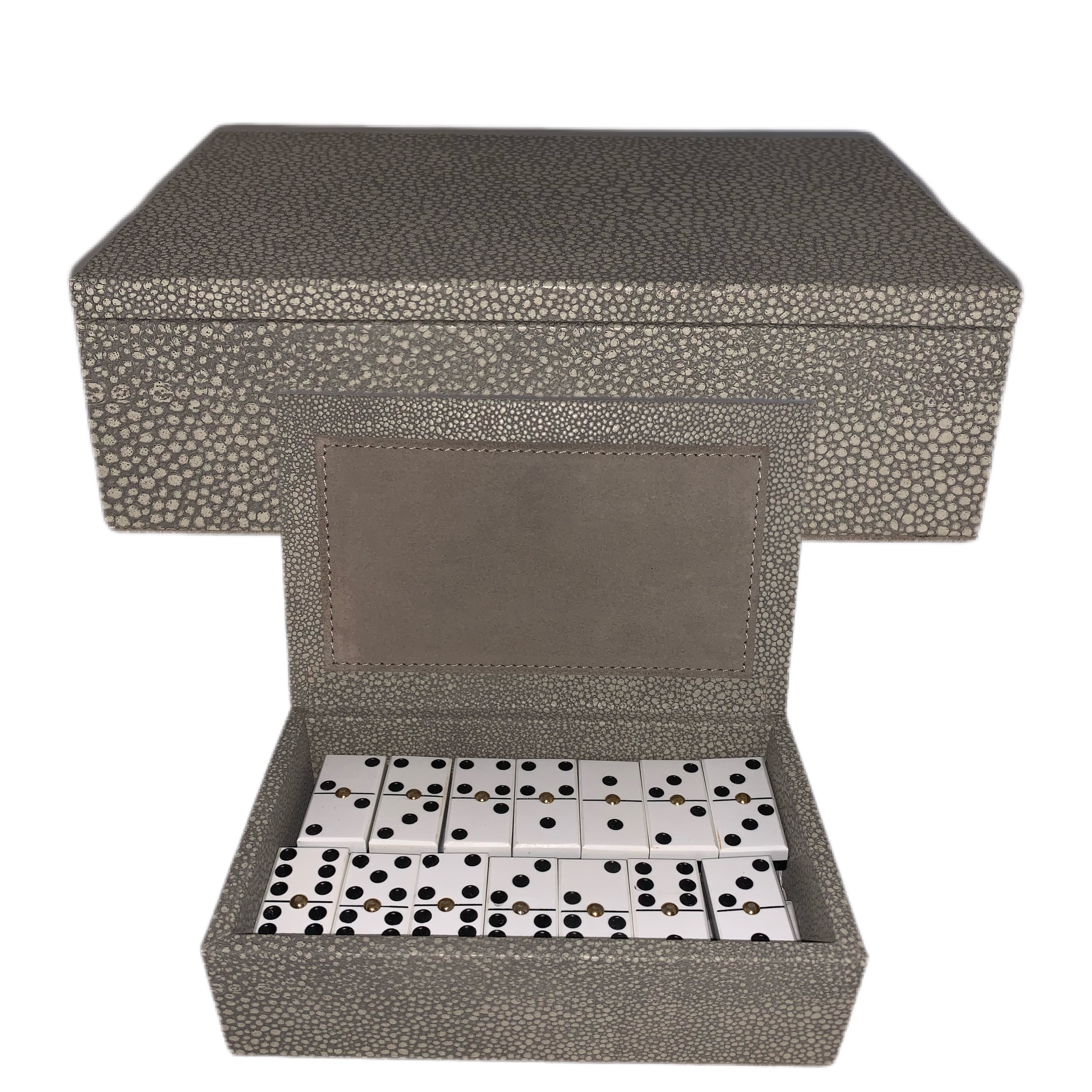 Juego de mesa que se compone de 28 fichas rectangulares. En este juego pueden participar dos, tres o cuatro personas. Caja elaborada en piel,