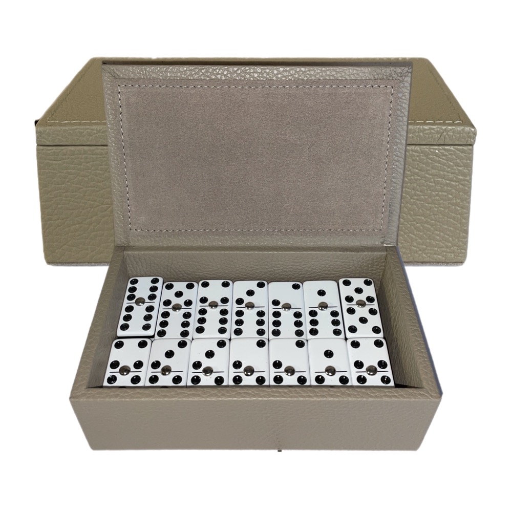 Juego de mesa que se compone de 28 fichas rectangulares. En este juego pueden participar dos, tres o cuatro personas. Caja elaborada en piel.