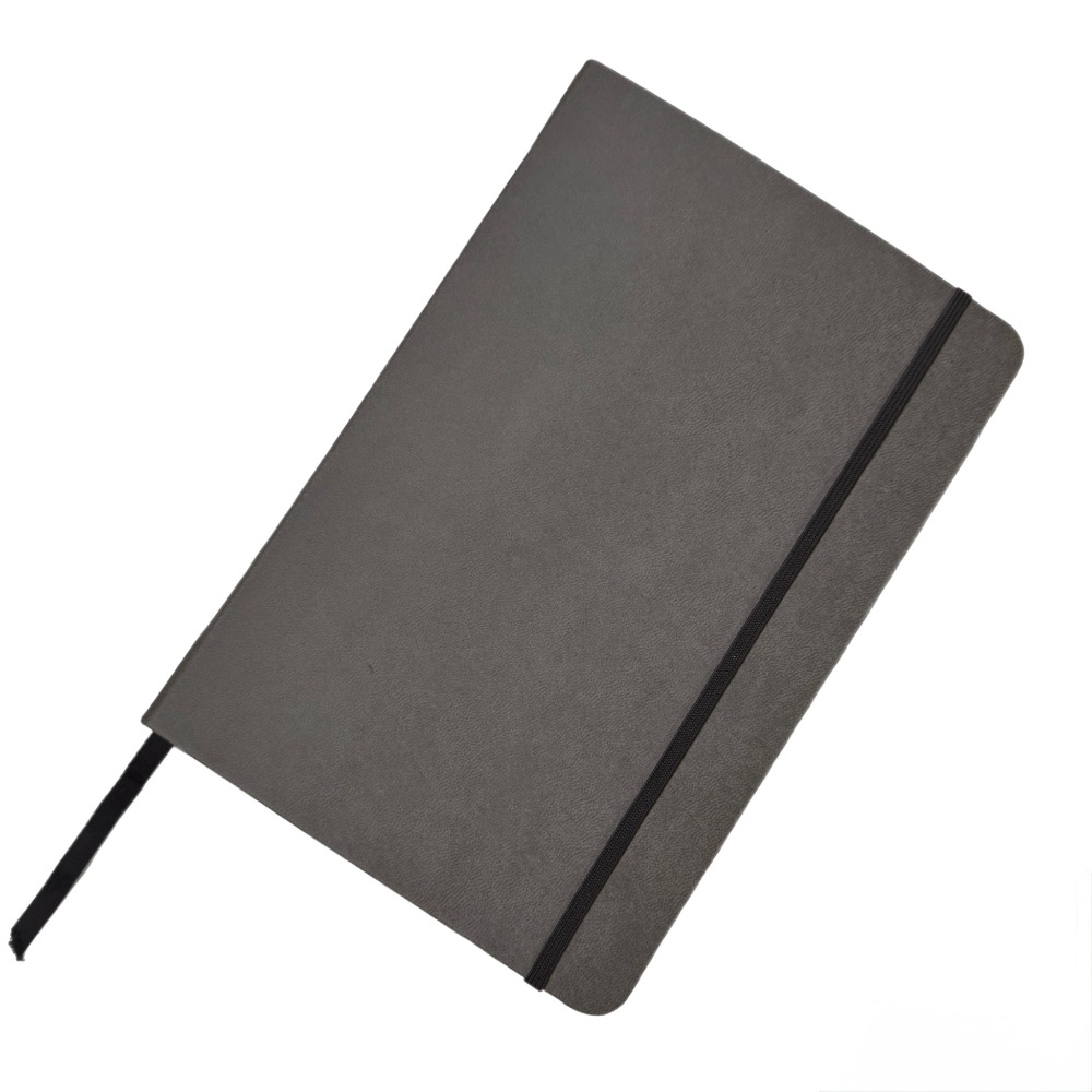 Libreta tamaño esquela tipo italiana con forro en vinipiel gris, interiores impresos a 1 tinta con 80 hojas rayadas, encuadernado tipo libro. Elástico para cerrar en el exterior color negro.