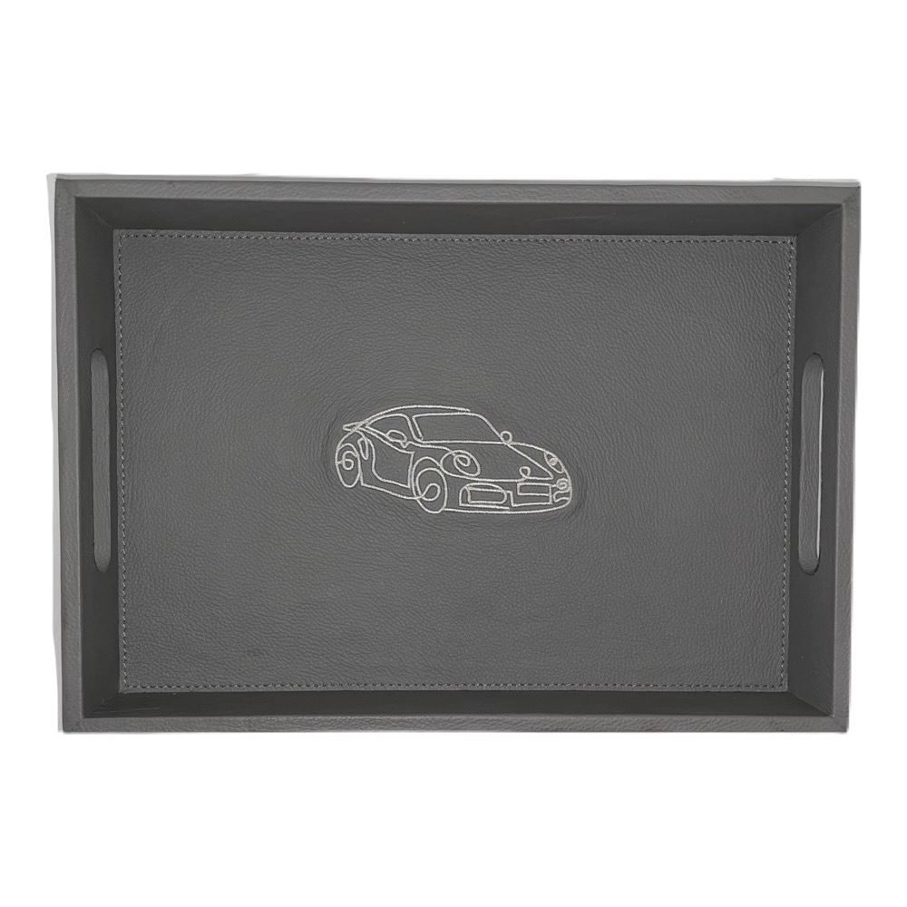 Charola servicio mini piel gris textura con auto deportivo bordada al centro.